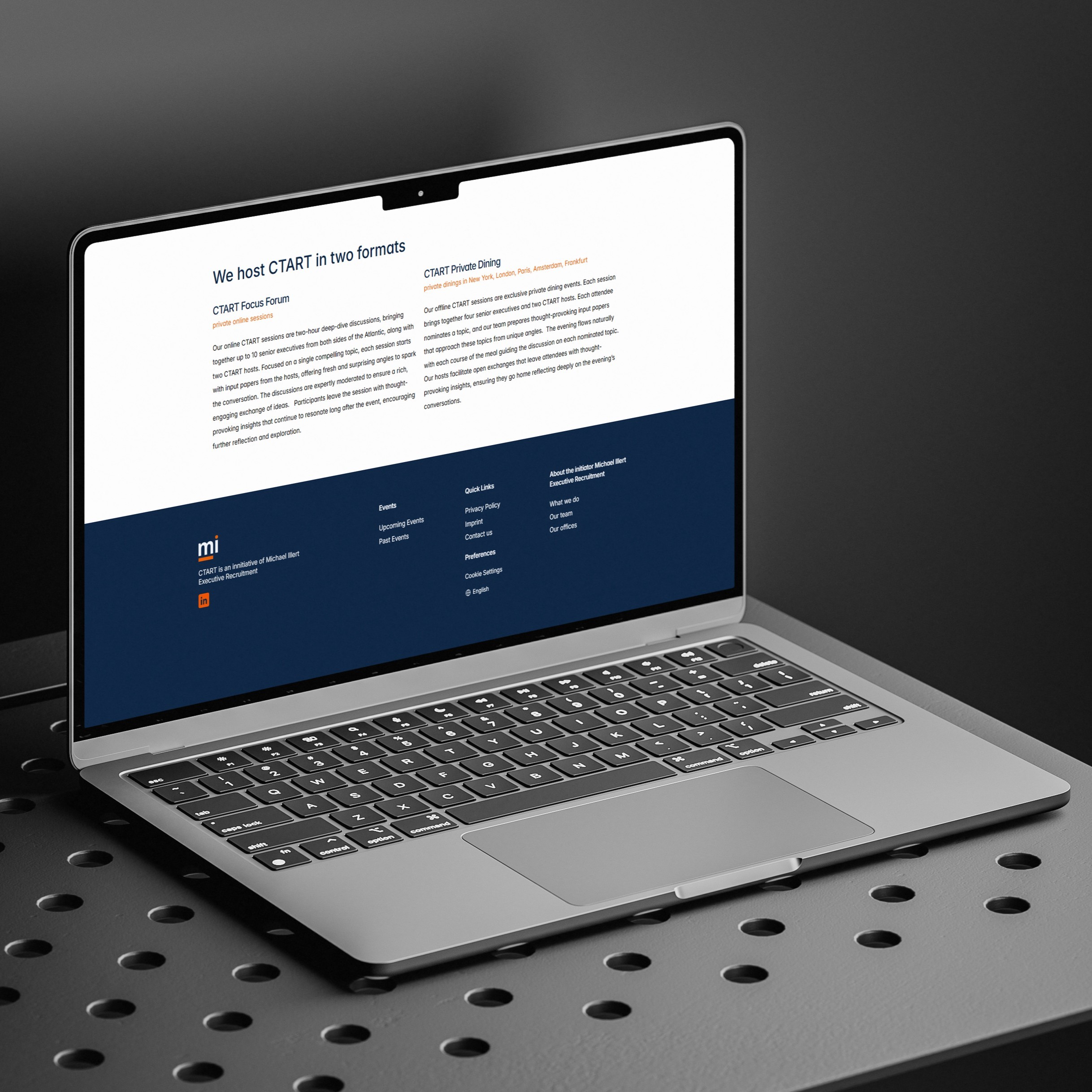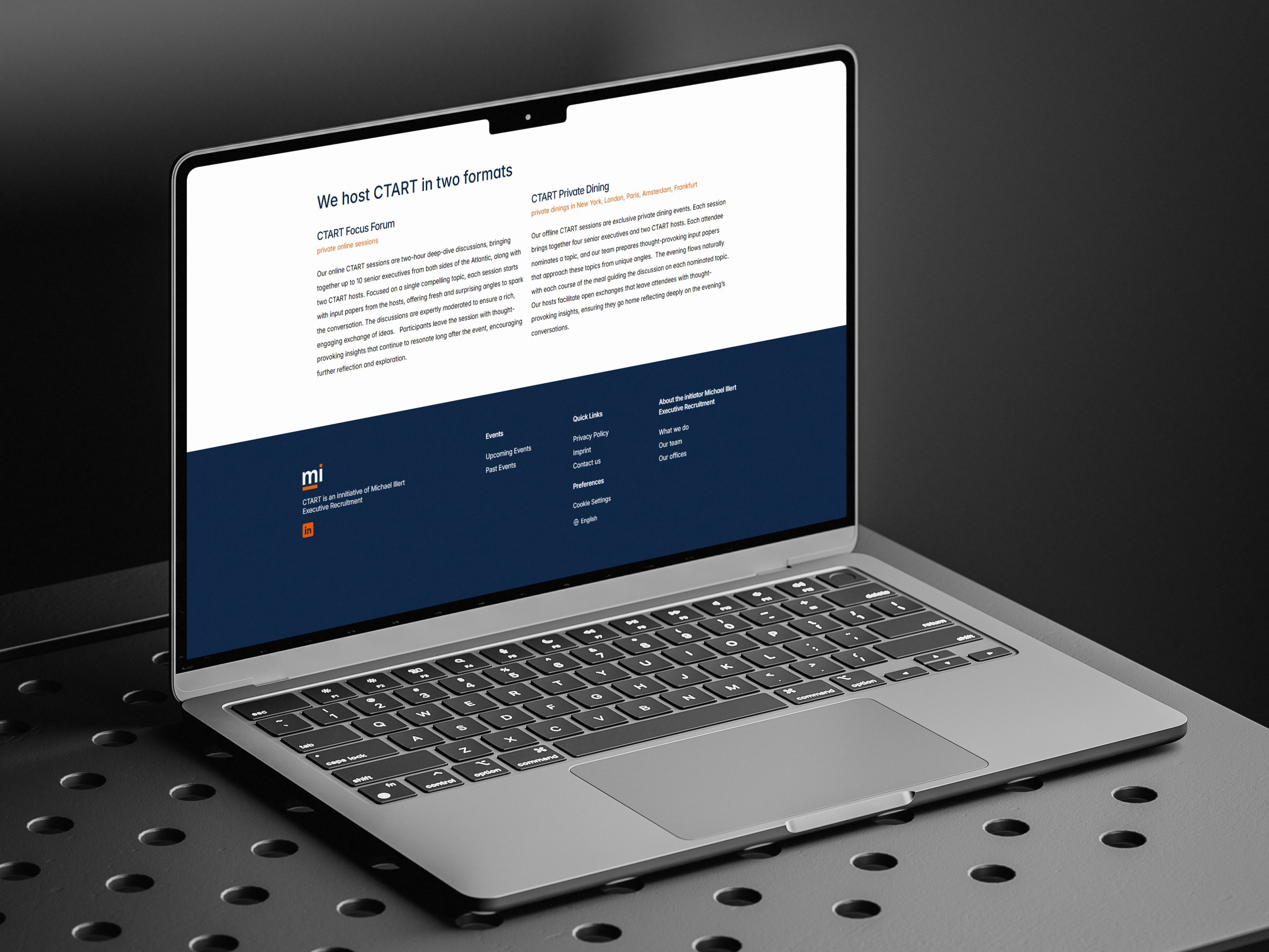 CTART.live is het digitale platform van CTART, ofwel C-Suite TransAtlantic Round Tables. Dit initiatief van Michael Illert Executive Recruitment brengt top-executives van beide zijden van de Atlantische Oceaan samen voor exclusieve roundtables en private dinings. Voor deze klant hebben wij een complete Framer website ontworpen en gebouwd die de exclusiviteit en het kaliber van het netwerk direct uitstraalt.