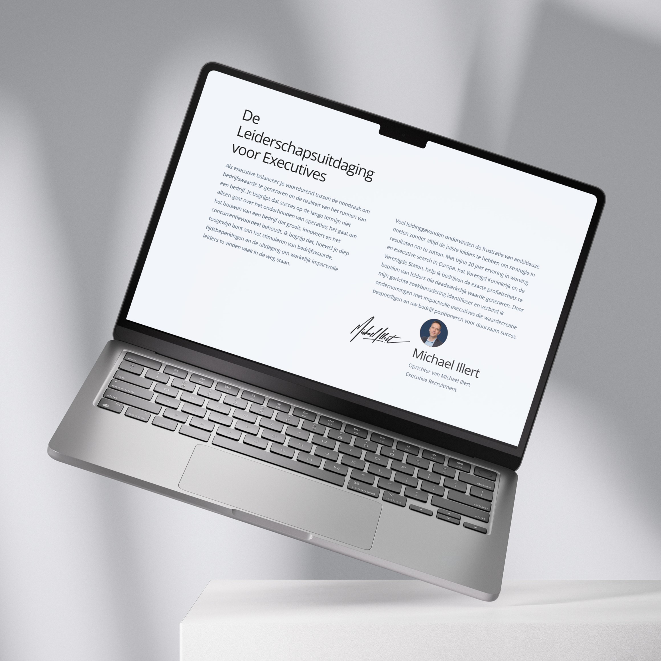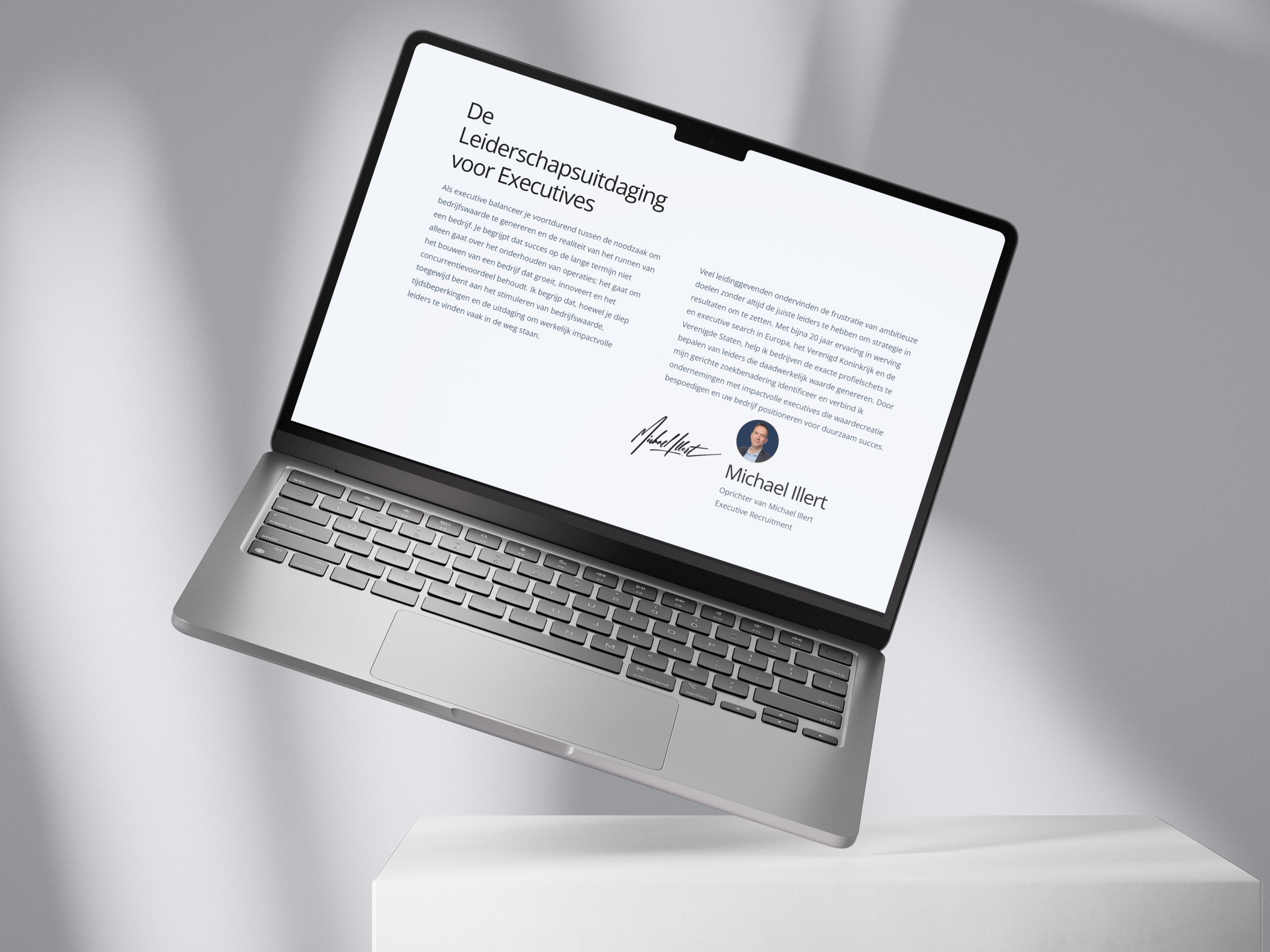 Michaelillert.com is de website van Michael Illert Executive Recruitment, een internationaal boutiquebureau gespecialiseerd in executive search en recruitment voor middelgrote bedrijven met een internationale footprint. Voor deze klant hebben wij een complete Framer-website ontworpen en gebouwd die de autoriteit, het netwerk en de persoonlijke aanpak van het bureau direct zichtbaar maakt.