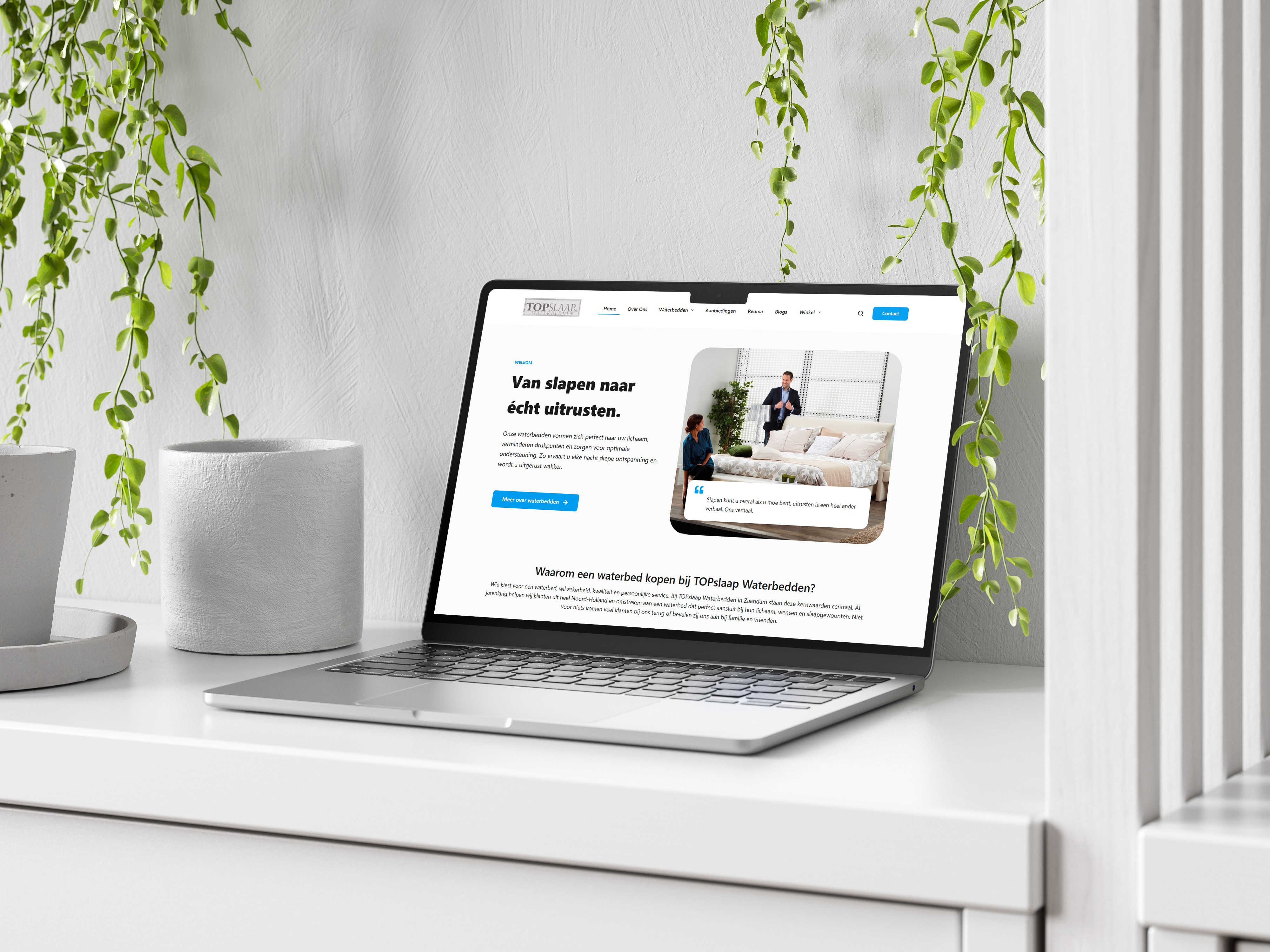 TOPslaap Waterbedden bedient klanten uit heel Noord-Holland en omstreken en onderscheidt zich met een uitgebreide showroom over twee verdiepingen, persoonlijke service en een breed assortiment aan waterbedden van Hollandse en Duitse kwaliteit. De oude website was traag, overladen met plugins en niet geoptimaliseerd voor zoekmachines.